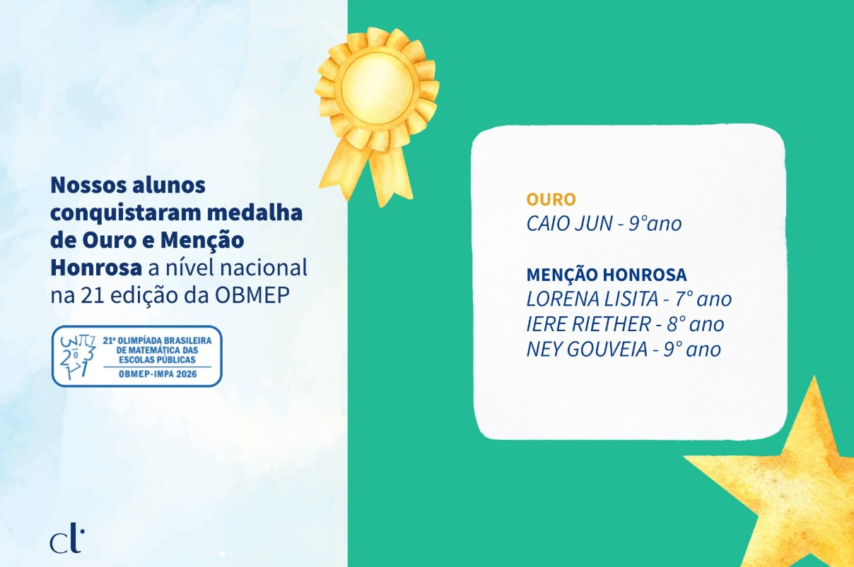 O estudante Caio Jun conquistou medalha de ouro em nível nacional, e os alunos Lorena Lisita, Iere Riether e Ney Gouveia receberam menção honrosa, também em nível nacional. Resultados que evidenciam não apenas o desempenho acadêmico, mas o compromisso, a dedicação e a constância no estudo.