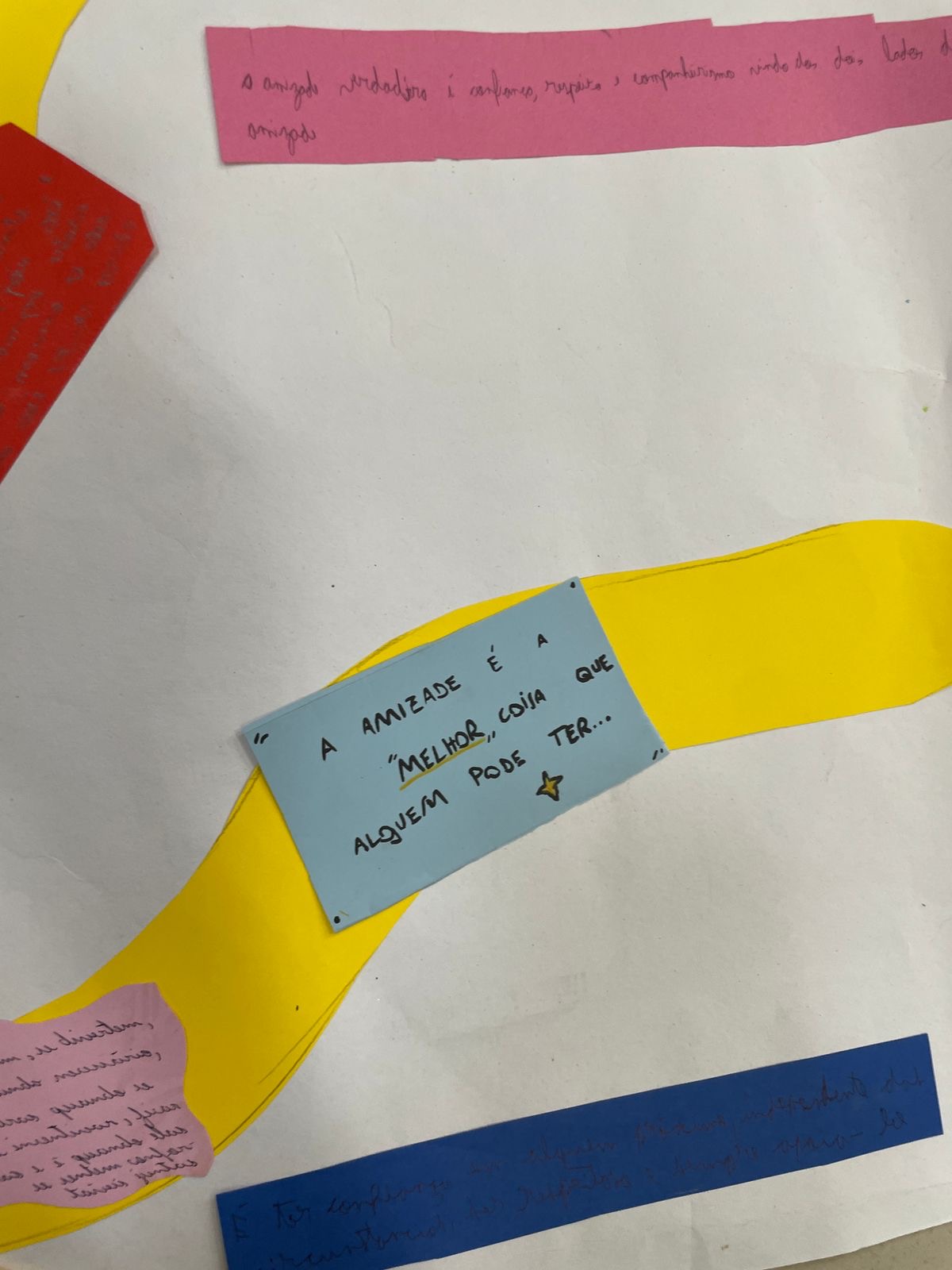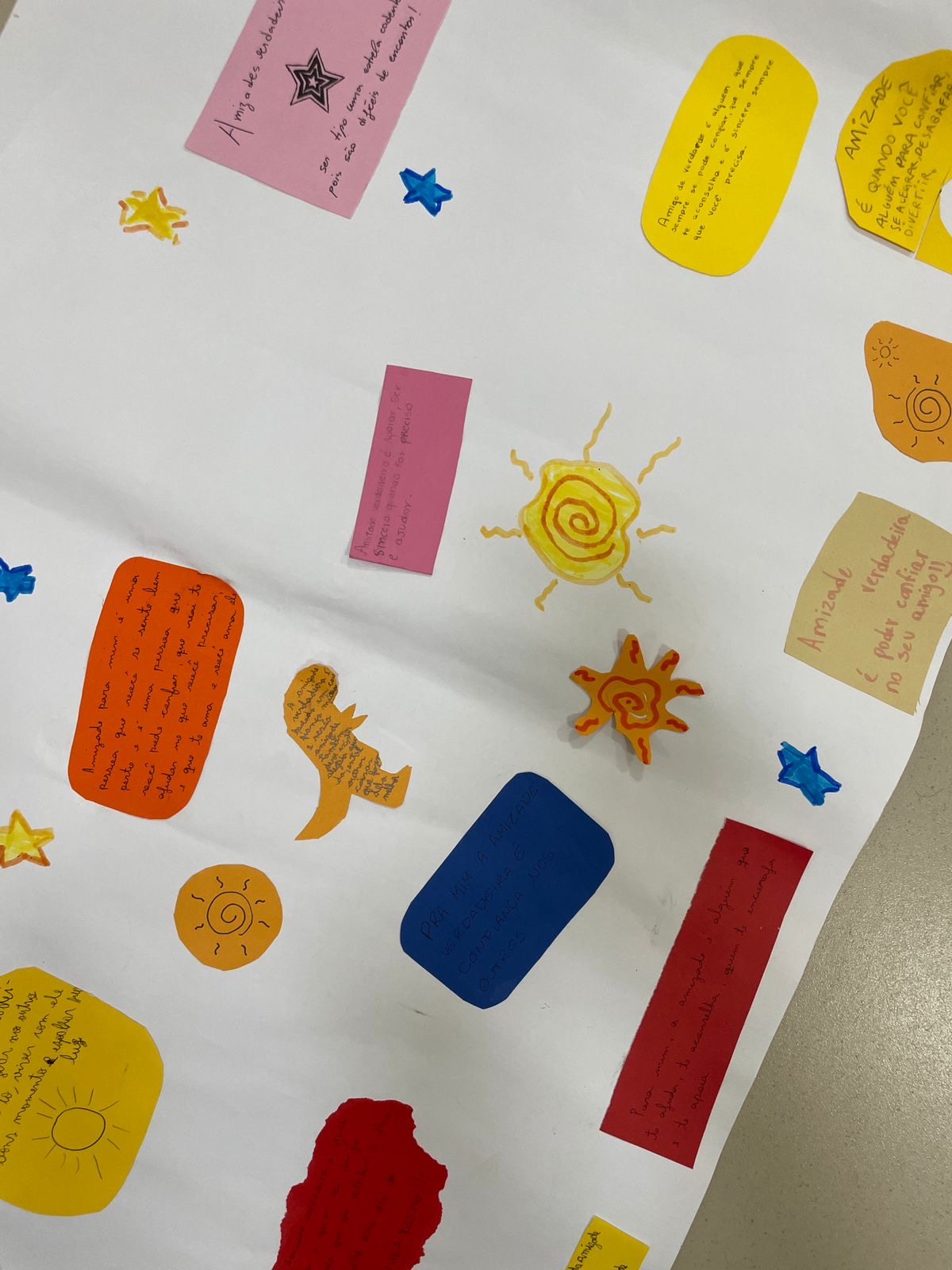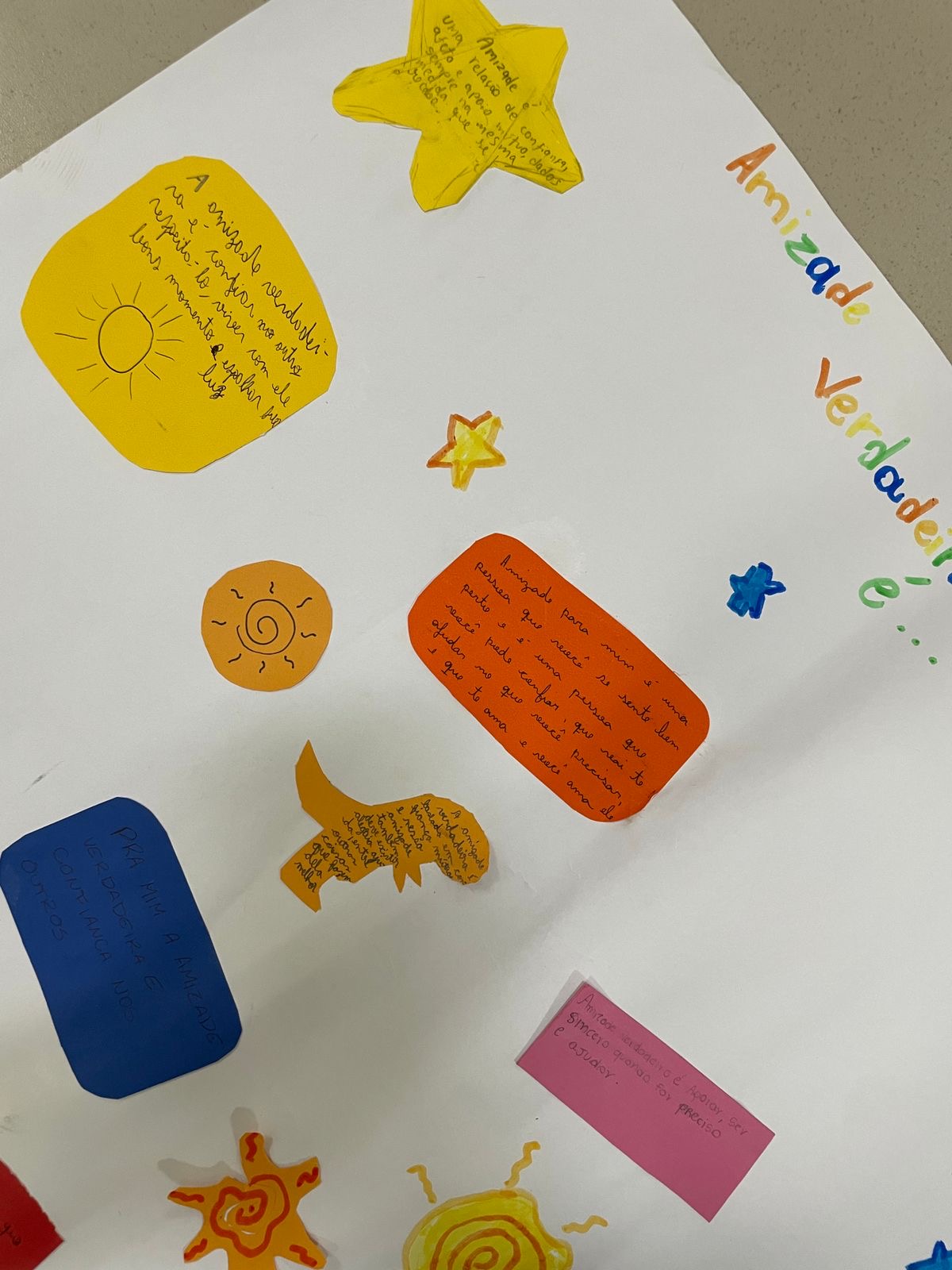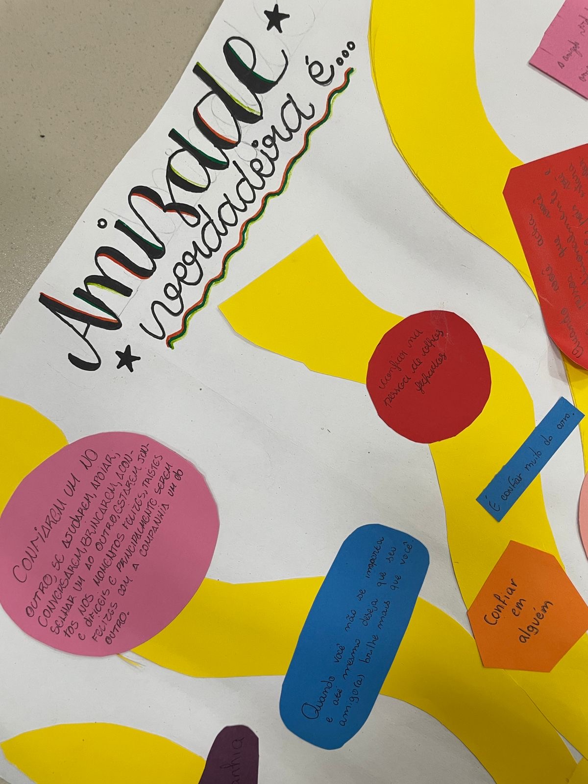 Durante a atividade, os estudantes escreveram mensagens destacando virtudes dos colegas, participaram de reflexões coletivas sobre o significado da amizade verdadeira e colaboraram na produção de um cartaz coletivo. O momento favoreceu trocas positivas, aproximação entre os alunos e o cultivo de atitudes pautadas no respeito genuíno e nas virtudes humanas.